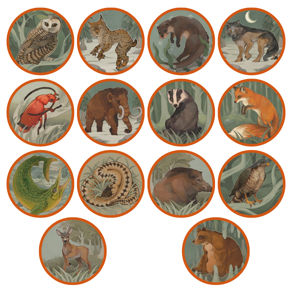 - 13 illustrated animal discs suspended from trees with a 14th bonus disc to find if you wish!